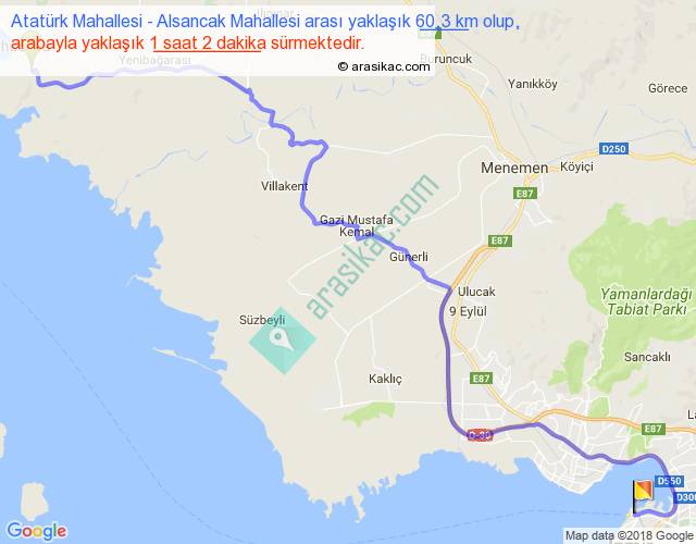 Atatürk Mahallesi - Alsancak Mahallesi arası yaklaşık olarak 90 km/h ile yukarıda belirtilen sürede olup, iki yerin kuş uçuşu uzaklığı (mesafesi) 41'dir. Yolculuk otobüsle 1 saat 20 dakika sürmektedir.