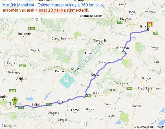 Atatürk Mahallesi - Eskişehir arası yaklaşık olarak 90 km/h ile yukarıda belirtilen sürede olup, iki yerin kuş uçuşu uzaklığı (mesafesi) 281'dir. Eğer belirtilen yerler arasında uçak seferi var ise bu süre uçakla 25 dakika'ya kadar düşebilir. Yolculuk otobüsle 5 saat 49 dakika sürmektedir.