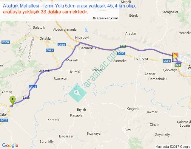 Atatürk Mahallesi - İzmir Yolu 5.km arası yaklaşık olarak 90 km/h ile yukarıda belirtilen sürede olup, iki yerin kuş uçuşu uzaklığı (mesafesi) 34'dir. Yolculuk otobüsle 42 dakika sürmektedir.