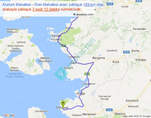 Atatürk Mahallesi - Ören Mahallesi arası yaklaşık olarak 90 km/h ile yukarıda belirtilen sürede olup, iki yerin kuş uçuşu uzaklığı (mesafesi) 94'dir. Yolculuk otobüsle 2 saat 51 dakika sürmektedir.