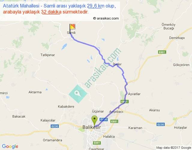 Atatürk Mahallesi - Samli arası yaklaşık olarak 90 km/h ile yukarıda belirtilen sürede olup, iki yerin kuş uçuşu uzaklığı (mesafesi) 19'dir. Yolculuk otobüsle 41 dakika sürmektedir.