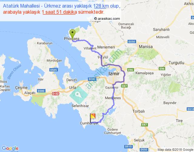 Atatürk Mahallesi - Ürkmez arası yaklaşık olarak 90 km/h ile yukarıda belirtilen sürede olup, iki yerin kuş uçuşu uzaklığı (mesafesi) 66'dir. Yolculuk otobüsle 2 saat 24 dakika sürmektedir.