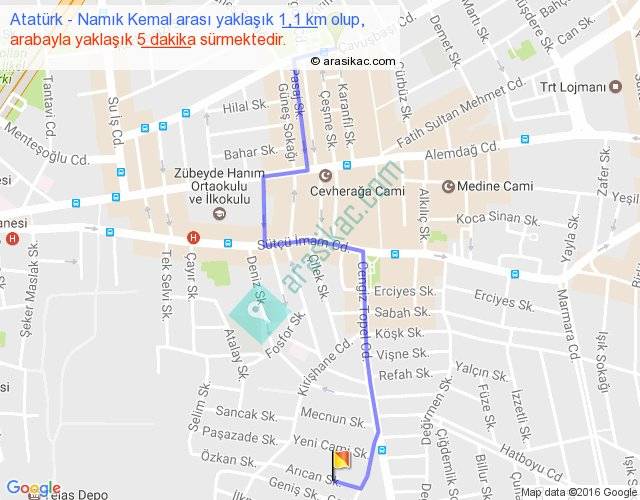 Atatürk - Namık Kemal arası yaklaşık olarak 90 km/h ile yukarıda belirtilen sürede olup, iki yerin kuş uçuşu uzaklığı (mesafesi) 1'dir. Yolculuk otobüsle 6 dakika sürmektedir.