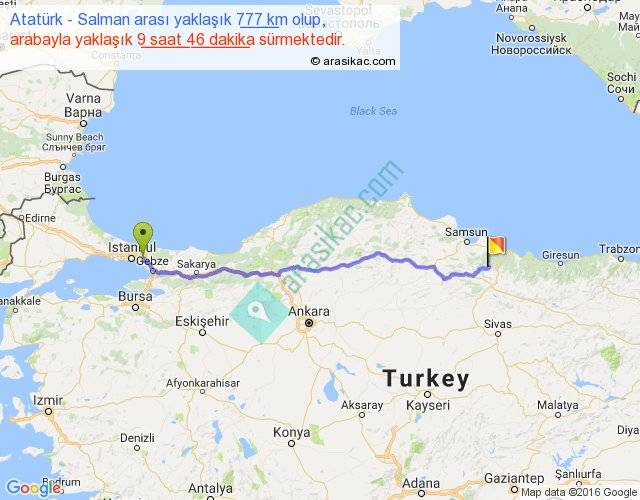 Atatürk - Salman arası yaklaşık olarak 90 km/h ile yukarıda belirtilen sürede olup, iki yerin kuş uçuşu uzaklığı (mesafesi) 634'dir. Eğer belirtilen yerler arasında uçak seferi var ise bu süre uçakla 58 dakika'ya kadar düşebilir. Yolculuk otobüsle 12 saat 41 dakika sürmektedir.