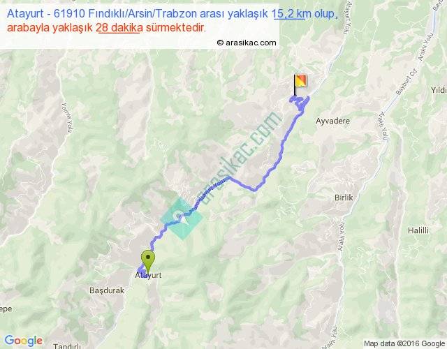 Atayurt - 61910 Fındıklı Arsin Trabzon arası yaklaşık olarak 90 km/h ile yukarıda belirtilen sürede olup, iki yerin kuş uçuşu uzaklığı (mesafesi) 10'dir. Yolculuk otobüsle 36 dakika sürmektedir.