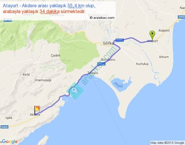 Atayurt - Akdere arası yaklaşık olarak 90 km/h ile yukarıda belirtilen sürede olup, iki yerin kuş uçuşu uzaklığı (mesafesi) 29'dir. Yolculuk otobüsle 44 dakika sürmektedir.
