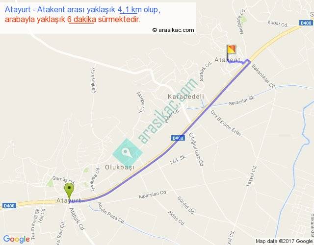 Atayurt - Atakent arası yaklaşık olarak 90 km/h ile yukarıda belirtilen sürede olup, iki yerin kuş uçuşu uzaklığı (mesafesi) 3'dir. Yolculuk otobüsle 7 dakika sürmektedir.