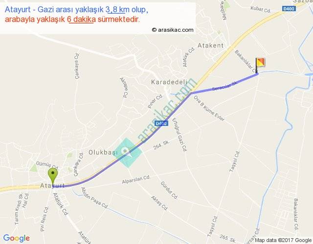 Atayurt - Gazi arası yaklaşık olarak 90 km/h ile yukarıda belirtilen sürede olup, iki yerin kuş uçuşu uzaklığı (mesafesi) 4'dir. Yolculuk otobüsle 7 dakika sürmektedir.