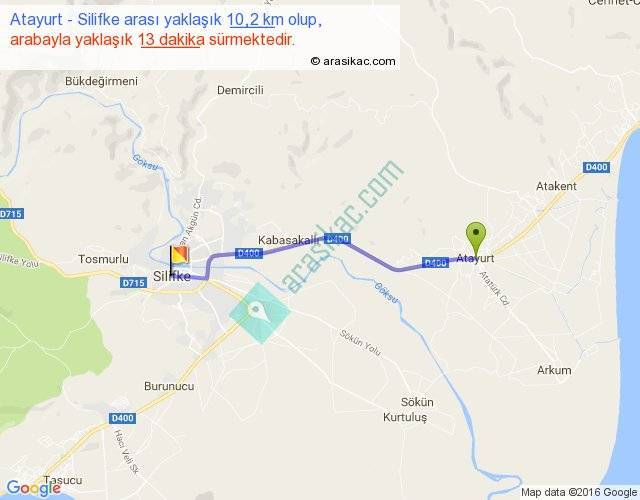 Atayurt - Silifke arası yaklaşık olarak 90 km/h ile yukarıda belirtilen sürede olup, iki yerin kuş uçuşu uzaklığı (mesafesi) 9'dir. Yolculuk otobüsle 16 dakika sürmektedir.