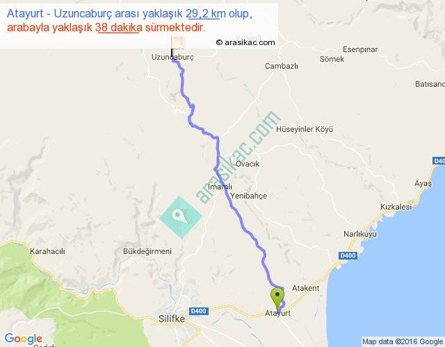 Atayurt - Uzuncaburç arası yaklaşık olarak 90 km/h ile yukarıda belirtilen sürede olup, iki yerin kuş uçuşu uzaklığı (mesafesi) 24'dir. Yolculuk otobüsle 49 dakika sürmektedir.