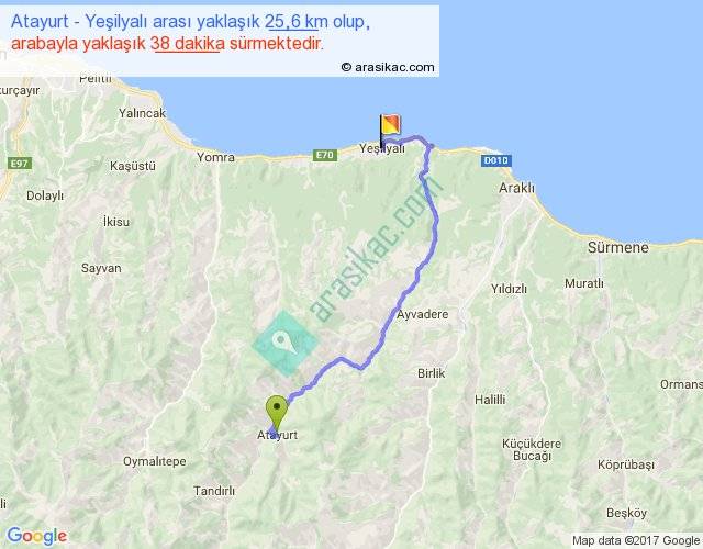 Atayurt - Yeşilyalı arası yaklaşık olarak 90 km/h ile yukarıda belirtilen sürede olup, iki yerin kuş uçuşu uzaklığı (mesafesi) 16'dir. Yolculuk otobüsle 49 dakika sürmektedir.