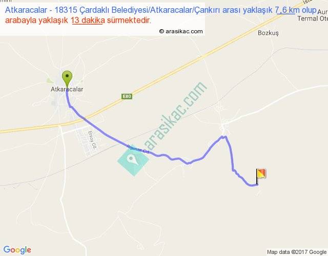 Atkaracalar - 18315 Çardaklı Belediyesi Atkaracalar Çankırı arası yaklaşık olarak 90 km/h ile yukarıda belirtilen sürede olup, iki yerin kuş uçuşu uzaklığı (mesafesi) 6'dir. Yolculuk otobüsle 16 dakika sürmektedir.