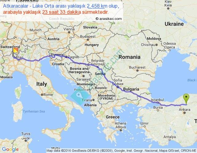 Atkaracalar - Lake Orta arası yaklaşık olarak 90 km/h ile yukarıda belirtilen sürede olup, iki yerin kuş uçuşu uzaklığı (mesafesi) 2051'dir. Eğer belirtilen yerler arasında uçak seferi var ise bu süre uçakla 3 saat 09 dakika'ya kadar düşebilir. Yolculuk otobüsle 1 gün 6 saat sürmektedir.