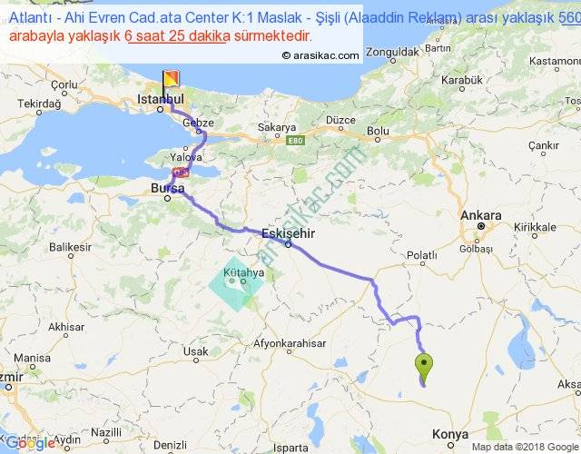 Atlantı - Ahi Evren Cad.ata Center K:1 Maslak - Şişli (Alaaddin Reklam) arası yaklaşık olarak 90 km/h ile yukarıda belirtilen sürede olup, iki yerin kuş uçuşu uzaklığı (mesafesi) 398'dir. Eğer belirtilen yerler arasında uçak seferi var ise bu süre uçakla 36 dakika'ya kadar düşebilir. Yolculuk otobüsle 8 saat 20 dakika sürmektedir.