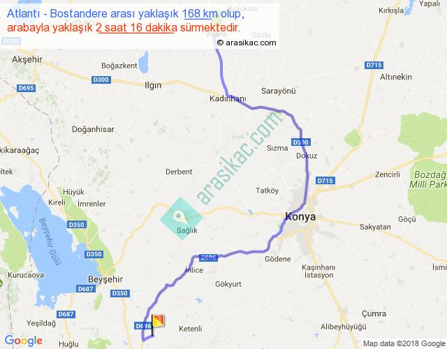 Atlantı - Bostandere arası yaklaşık olarak 90 km/h ile yukarıda belirtilen sürede olup, iki yerin kuş uçuşu uzaklığı (mesafesi) 106'dir. Yolculuk otobüsle 2 saat 56 dakika sürmektedir.