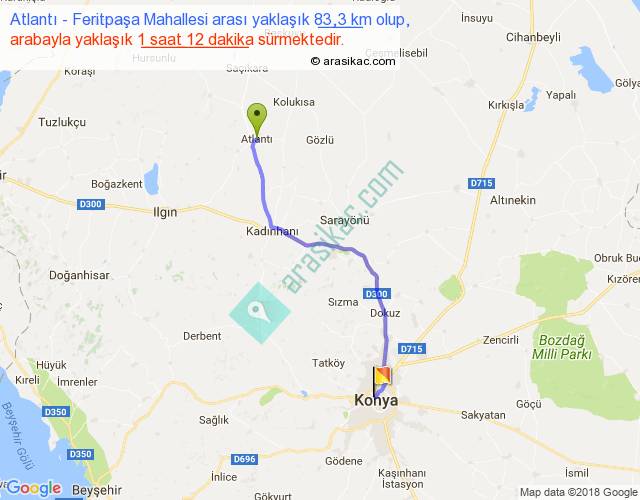 Atlantı - Feritpaşa Mahallesi arası yaklaşık olarak 90 km/h ile yukarıda belirtilen sürede olup, iki yerin kuş uçuşu uzaklığı (mesafesi) 68'dir. Yolculuk otobüsle 1 saat 33 dakika sürmektedir.