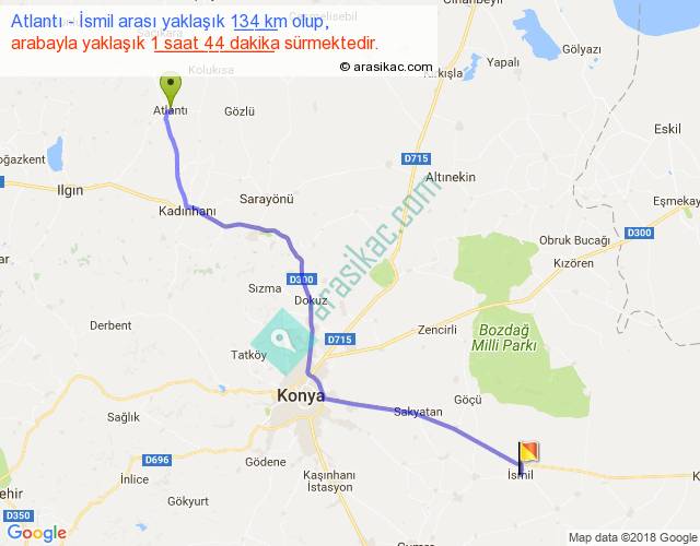 Atlantı - İsmil arası yaklaşık olarak 90 km/h ile yukarıda belirtilen sürede olup, iki yerin kuş uçuşu uzaklığı (mesafesi) 110'dir. Yolculuk otobüsle 2 saat 15 dakika sürmektedir.