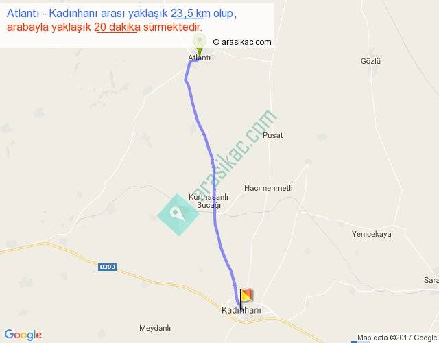 Atlantı - Kadınhanı arası yaklaşık olarak 90 km/h ile yukarıda belirtilen sürede olup, iki yerin kuş uçuşu uzaklığı (mesafesi) 22'dir. Yolculuk otobüsle 26 dakika sürmektedir.