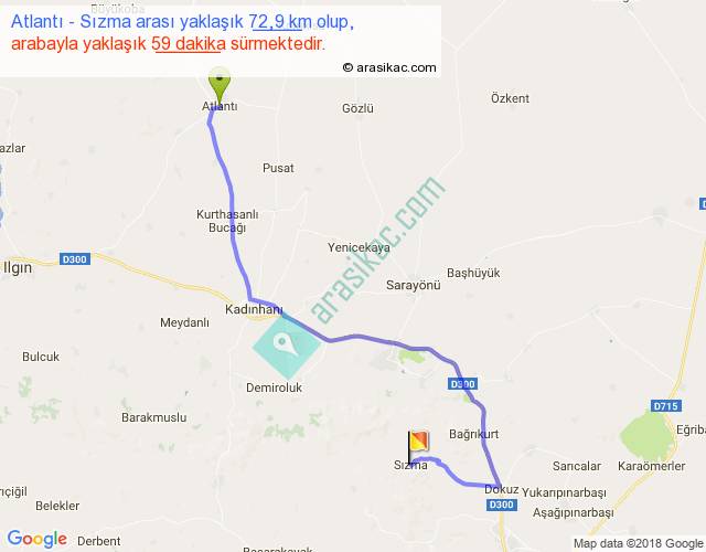 Atlantı - Sızma arası yaklaşık olarak 90 km/h ile yukarıda belirtilen sürede olup, iki yerin kuş uçuşu uzaklığı (mesafesi) 44'dir. Yolculuk otobüsle 1 saat 16 dakika sürmektedir.
