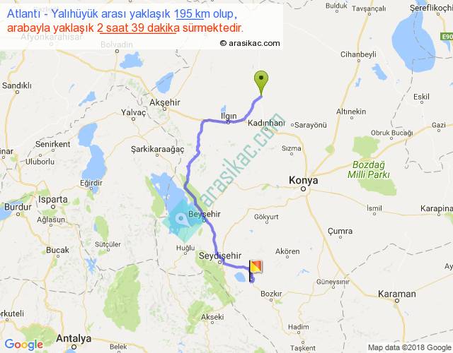 Atlantı - Yalıhüyük arası yaklaşık olarak 90 km/h ile yukarıda belirtilen sürede olup, iki yerin kuş uçuşu uzaklığı (mesafesi) 126'dir. Yolculuk otobüsle 3 saat 26 dakika sürmektedir.