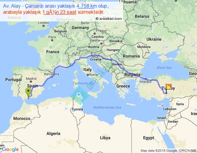 Av. Alay - Çamardı arası yaklaşık olarak 90 km/h ile yukarıda belirtilen sürede olup, iki yerin kuş uçuşu uzaklığı (mesafesi) 3454'dir. Eğer belirtilen yerler arasında uçak seferi var ise bu süre uçakla 5 saat 18 dakika'ya kadar düşebilir. Yolculuk otobüsle 2 gün 13 saat sürmektedir.