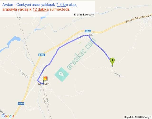 Avdan - Cenkyeri arası yaklaşık olarak 90 km/h ile yukarıda belirtilen sürede olup, iki yerin kuş uçuşu uzaklığı (mesafesi) 4'dir. Yolculuk otobüsle 15 dakika sürmektedir.