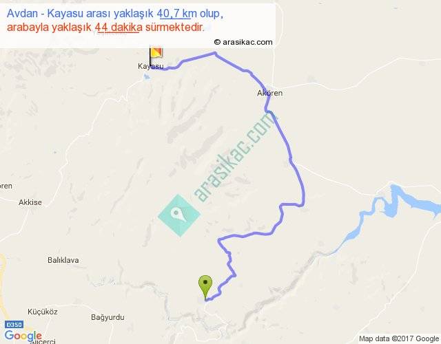 Avdan - Kayasu arası yaklaşık olarak 90 km/h ile yukarıda belirtilen sürede olup, iki yerin kuş uçuşu uzaklığı (mesafesi) 21'dir. Yolculuk otobüsle 57 dakika sürmektedir.