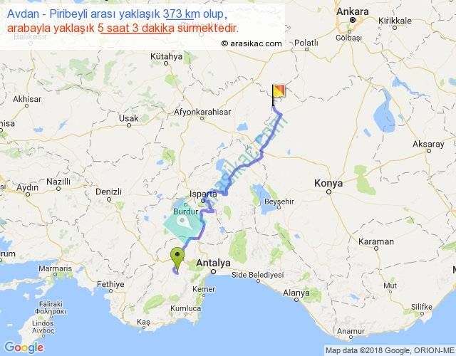Avdan - Piribeyli arası yaklaşık olarak 90 km/h ile yukarıda belirtilen sürede olup, iki yerin kuş uçuşu uzaklığı (mesafesi) 260'dir. Eğer belirtilen yerler arasında uçak seferi var ise bu süre uçakla 24 dakika'ya kadar düşebilir. Yolculuk otobüsle 6 saat 33 dakika sürmektedir.