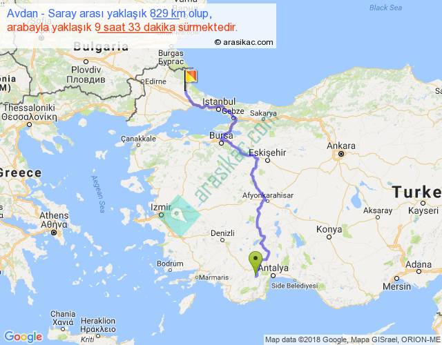 Avdan - Saray arası yaklaşık olarak 90 km/h ile yukarıda belirtilen sürede olup, iki yerin kuş uçuşu uzaklığı (mesafesi) 540'dir. Eğer belirtilen yerler arasında uçak seferi var ise bu süre uçakla 49 dakika'ya kadar düşebilir. Yolculuk otobüsle 12 saat 24 dakika sürmektedir.