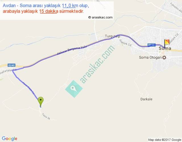 Avdan - Soma arası yaklaşık olarak 90 km/h ile yukarıda belirtilen sürede olup, iki yerin kuş uçuşu uzaklığı (mesafesi) 7'dir. Yolculuk otobüsle 19 dakika sürmektedir.