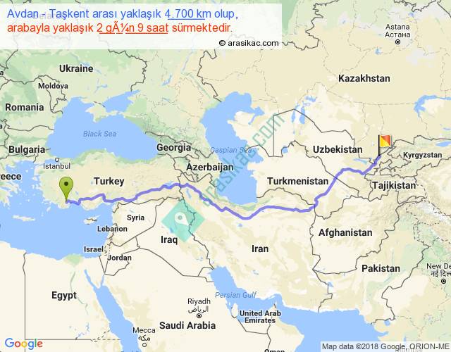 Avdan - Taşkent arası yaklaşık olarak 90 km/h ile yukarıda belirtilen sürede olup, iki yerin kuş uçuşu uzaklığı (mesafesi) 3361'dir. Eğer belirtilen yerler arasında uçak seferi var ise bu süre uçakla 5 saat 10 dakika'ya kadar düşebilir. Yolculuk otobüsle 3 gün 2 saat sürmektedir.
