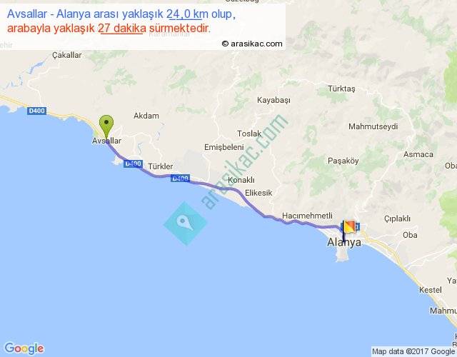 Avsallar - Alanya arası yaklaşık olarak 90 km/h ile yukarıda belirtilen sürede olup, iki yerin kuş uçuşu uzaklığı (mesafesi) 22'dir. Yolculuk otobüsle 36 dakika sürmektedir.
