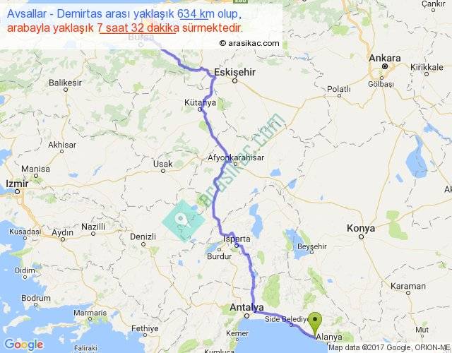Avsallar - Demirtas arası yaklaşık olarak 90 km/h ile yukarıda belirtilen sürede olup, iki yerin kuş uçuşu uzaklığı (mesafesi) 466'dir. Eğer belirtilen yerler arasında uçak seferi var ise bu süre uçakla 43 dakika'ya kadar düşebilir. Yolculuk otobüsle 9 saat 47 dakika sürmektedir.