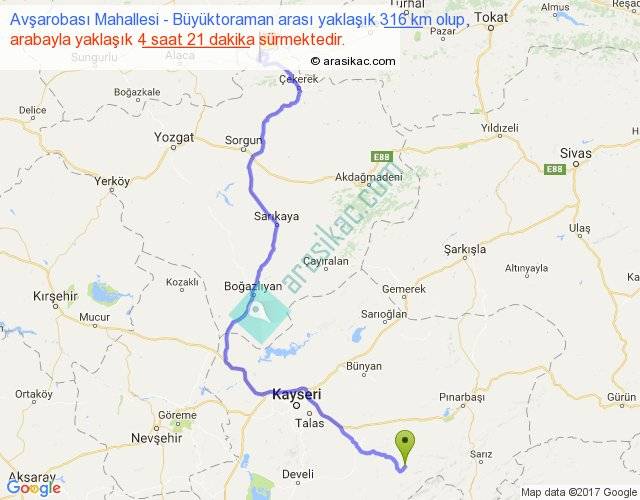 Avşarobası Mahallesi - Büyüktoraman arası yaklaşık olarak 90 km/h ile yukarıda belirtilen sürede olup, iki yerin kuş uçuşu uzaklığı (mesafesi) 202'dir. Yolculuk otobüsle 5 saat 39 dakika sürmektedir.