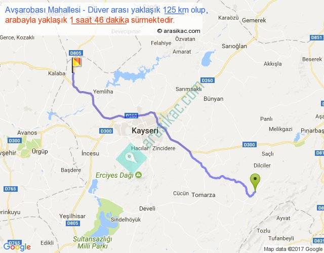 Avşarobası Mahallesi - Düver arası yaklaşık olarak 90 km/h ile yukarıda belirtilen sürede olup, iki yerin kuş uçuşu uzaklığı (mesafesi) 102'dir. Yolculuk otobüsle 2 saat 17 dakika sürmektedir.