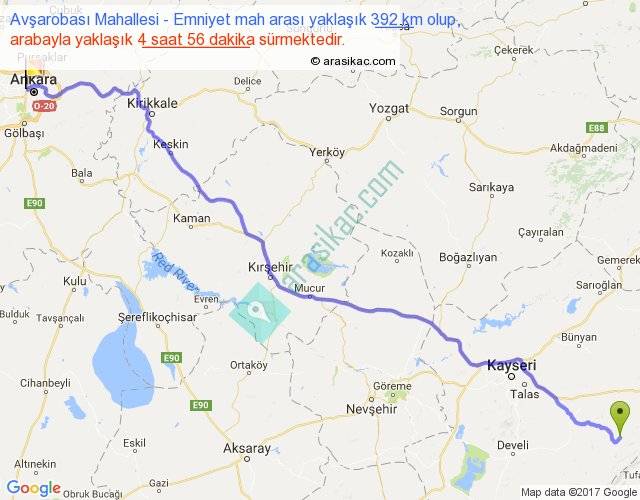 Avşarobası Mahallesi - Emniyet mah arası yaklaşık olarak 90 km/h ile yukarıda belirtilen sürede olup, iki yerin kuş uçuşu uzaklığı (mesafesi) 323'dir. Eğer belirtilen yerler arasında uçak seferi var ise bu süre uçakla 29 dakika'ya kadar düşebilir. Yolculuk otobüsle 6 saat 24 dakika sürmektedir.