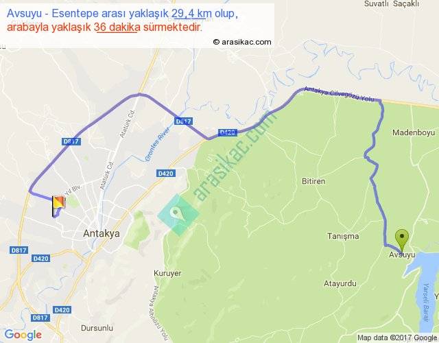 Avsuyu - Esentepe arası yaklaşık olarak 90 km/h ile yukarıda belirtilen sürede olup, iki yerin kuş uçuşu uzaklığı (mesafesi) 16'dir. Yolculuk otobüsle 46 dakika sürmektedir.
