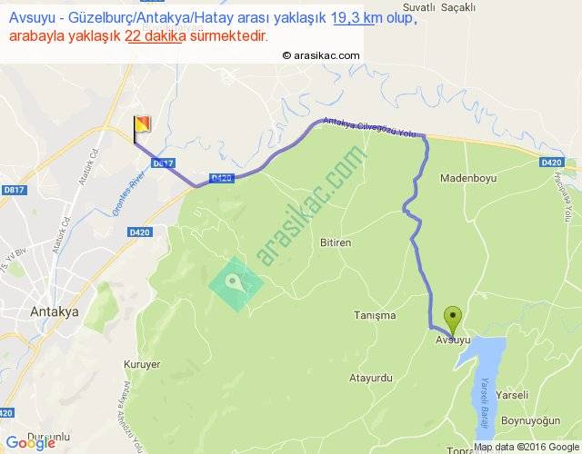 Avsuyu - Güzelburç Antakya Hatay arası yaklaşık olarak 90 km/h ile yukarıda belirtilen sürede olup, iki yerin kuş uçuşu uzaklığı (mesafesi) 13'dir. Yolculuk otobüsle 28 dakika sürmektedir.