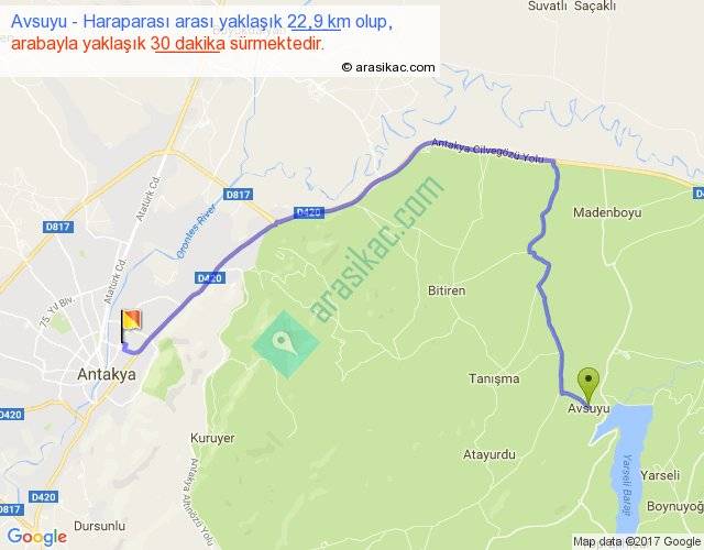 Avsuyu - Haraparası arası yaklaşık olarak 90 km/h ile yukarıda belirtilen sürede olup, iki yerin kuş uçuşu uzaklığı (mesafesi) 13'dir. Yolculuk otobüsle 39 dakika sürmektedir.