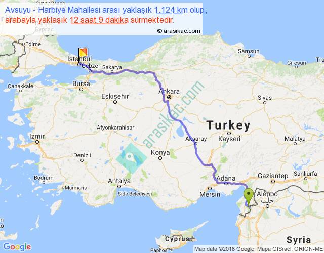Avsuyu - Harbiye Mahallesi arası yaklaşık olarak 90 km/h ile yukarıda belirtilen sürede olup, iki yerin kuş uçuşu uzaklığı (mesafesi) 829'dir. Eğer belirtilen yerler arasında uçak seferi var ise bu süre uçakla 1 saat 16 dakika'ya kadar düşebilir. Yolculuk otobüsle 15 saat 47 dakika sürmektedir.
