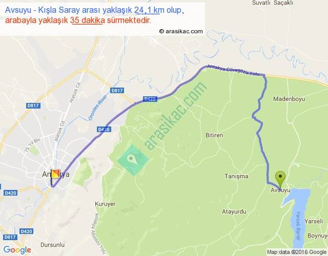 Avsuyu - Kışla Saray arası yaklaşık olarak 90 km/h ile yukarıda belirtilen sürede olup, iki yerin kuş uçuşu uzaklığı (mesafesi) 14'dir. Yolculuk otobüsle 45 dakika sürmektedir.