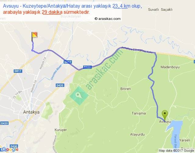 Avsuyu - Kuzeytepe Antakya Hatay arası yaklaşık olarak 90 km/h ile yukarıda belirtilen sürede olup, iki yerin kuş uçuşu uzaklığı (mesafesi) 16'dir. Yolculuk otobüsle 37 dakika sürmektedir.