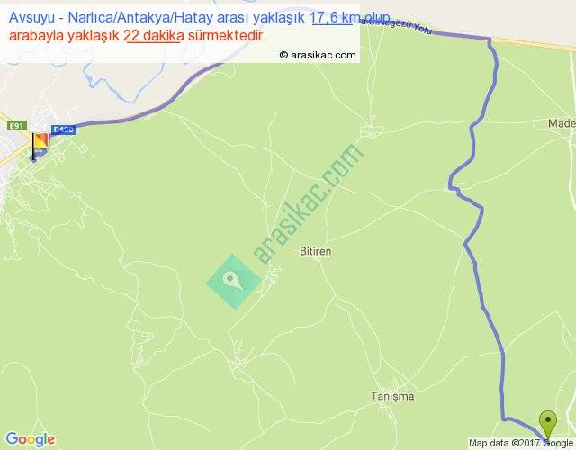Avsuyu - Narlıca Antakya Hatay arası yaklaşık olarak 90 km/h ile yukarıda belirtilen sürede olup, iki yerin kuş uçuşu uzaklığı (mesafesi) 10'dir. Yolculuk otobüsle 28 dakika sürmektedir.