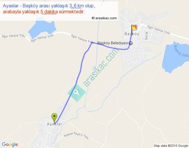 Ayaslar - Başköy arası yaklaşık olarak 90 km/h ile yukarıda belirtilen sürede olup, iki yerin kuş uçuşu uzaklığı (mesafesi) 3'dir. Yolculuk otobüsle 6 dakika sürmektedir.