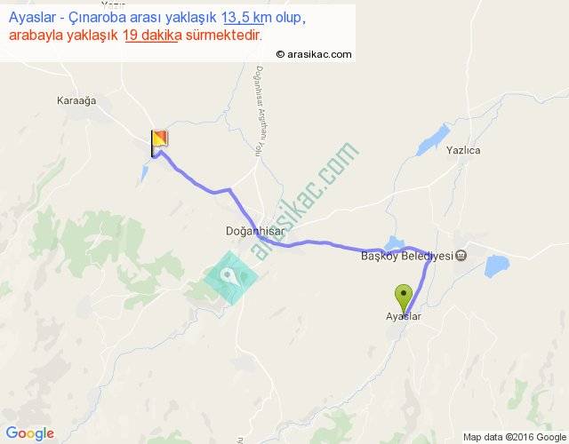 Ayaslar - Çınaroba arası yaklaşık olarak 90 km/h ile yukarıda belirtilen sürede olup, iki yerin kuş uçuşu uzaklığı (mesafesi) 10'dir. Yolculuk otobüsle 24 dakika sürmektedir.