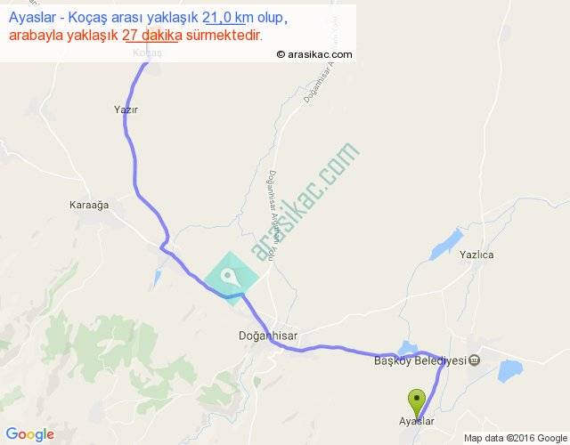 Ayaslar - Koçaş arası yaklaşık olarak 90 km/h ile yukarıda belirtilen sürede olup, iki yerin kuş uçuşu uzaklığı (mesafesi) 15'dir. Yolculuk otobüsle 35 dakika sürmektedir.