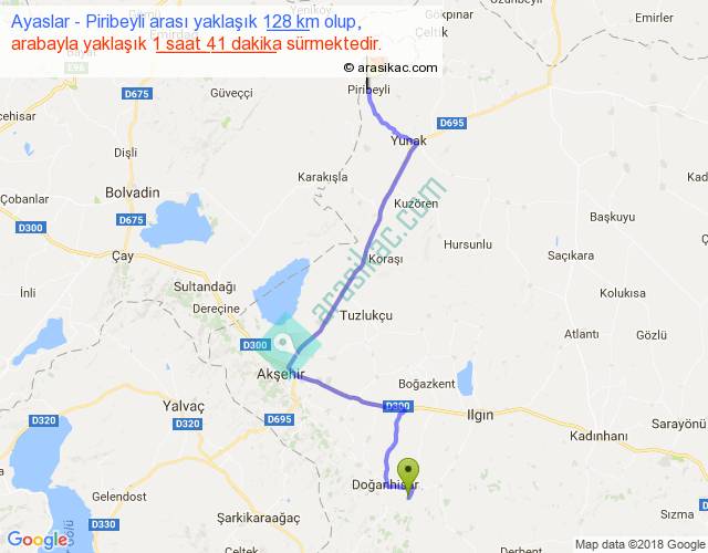Ayaslar - Piribeyli arası yaklaşık olarak 90 km/h ile yukarıda belirtilen sürede olup, iki yerin kuş uçuşu uzaklığı (mesafesi) 88'dir. Yolculuk otobüsle 2 saat 11 dakika sürmektedir.