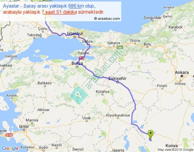 Ayaslar - Saray arası yaklaşık olarak 90 km/h ile yukarıda belirtilen sürede olup, iki yerin kuş uçuşu uzaklığı (mesafesi) 489'dir. Eğer belirtilen yerler arasında uçak seferi var ise bu süre uçakla 45 dakika'ya kadar düşebilir. Yolculuk otobüsle 10 saat 12 dakika sürmektedir.