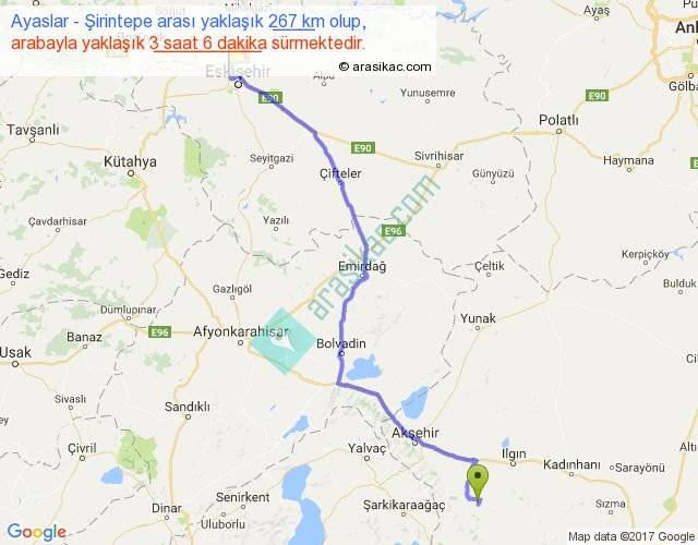 Ayaslar - Şirintepe arası yaklaşık olarak 90 km/h ile yukarıda belirtilen sürede olup, iki yerin kuş uçuşu uzaklığı (mesafesi) 214'dir. Yolculuk otobüsle 4 saat 1 dakika sürmektedir.