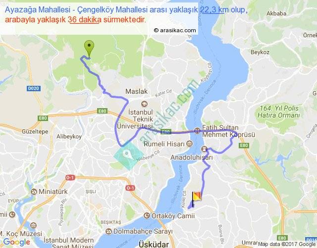 Ayazağa Mahallesi - Çengelköy Mahallesi arası yaklaşık olarak 90 km/h ile yukarıda belirtilen sürede olup, iki yerin kuş uçuşu uzaklığı (mesafesi) 10'dir. Yolculuk otobüsle 46 dakika sürmektedir.
